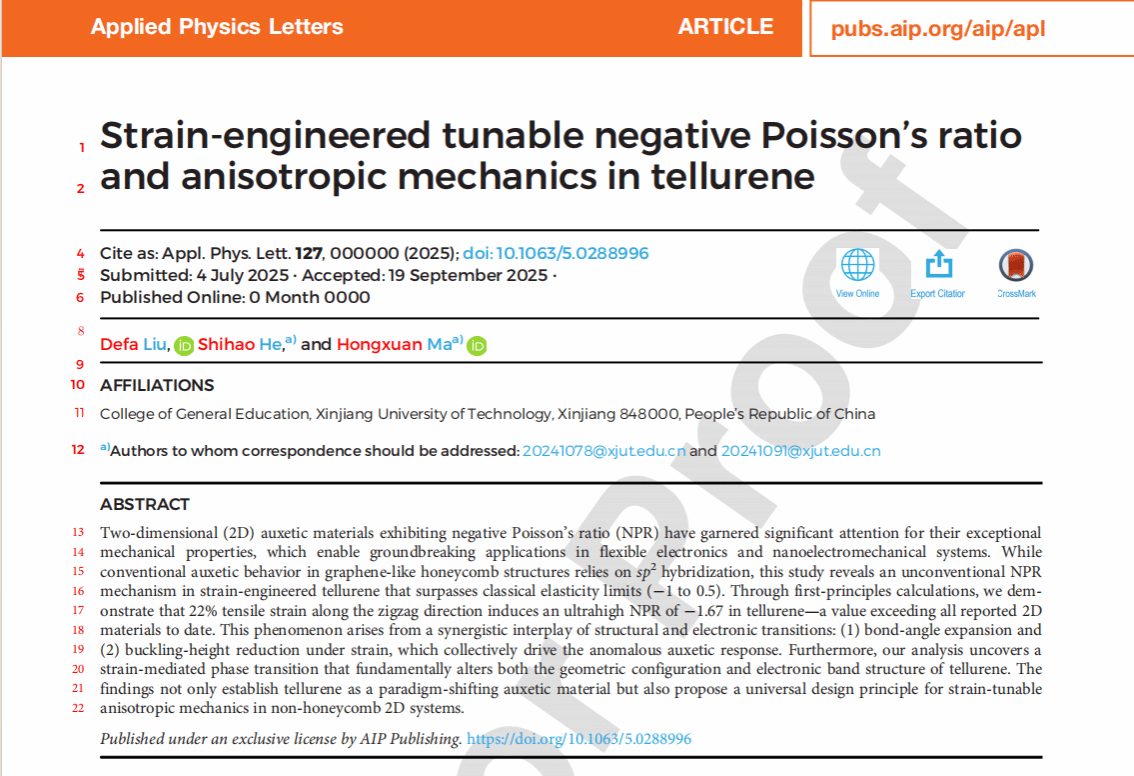 近日,Beat365官方网站通识学院物理教研部在二维材料力学领域取得重要进展。相关研究成果以《Strain-engineered tunable negative Poisson’s ratio and anisotropic mechanics in tellurene》为题,发表于物理学重要期刊《Applied Physics Letters》,为柔性电子、纳米机电系统等领域的材料创新提供了全新方向。该期刊由美国物理联合会出版,聚焦应用物理领域的前沿重要发现,快速传播最新前沿研究动态,是具有全球影响力的权威学术期刊,为物理界内同行高度认可。