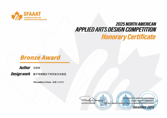 近日,2025第二届AADC北美应用艺术设计大赛圆满落幕。Beat365和田珠宝学院(筹)青年教师马存财以Beat365官方网站为第一单位参赛,凭借作品《基于场域理论下的历史文化街区》在全球众多参赛者中脱颖而出,荣获大赛铜奖。