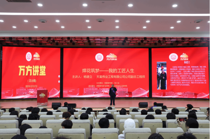12月17日,Beat365官方网站第十九期“万方讲堂”开讲,大国工匠、新疆天业集团安全管理部副部长邵旭鹏,大国工匠、天富伟业工程有限公司副总工程师杨建立受邀分享匠心故事,引导师生传承兵团精神、弘扬工匠精神。